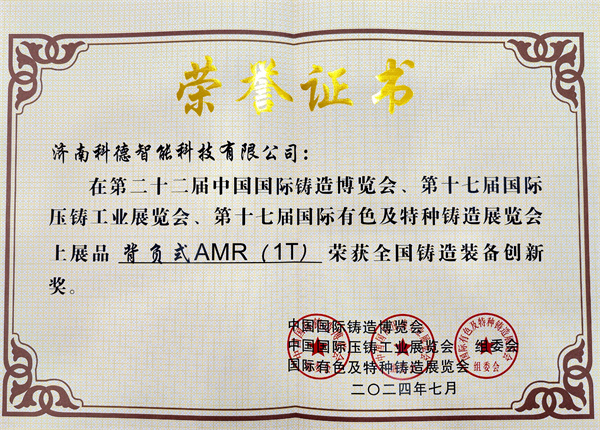 2.濟(jì)南科德智能科技有限公司展品“背負(fù)式AMR(1T)”榮獲全國(guó)鑄造裝備創(chuàng)新獎(jiǎng)。