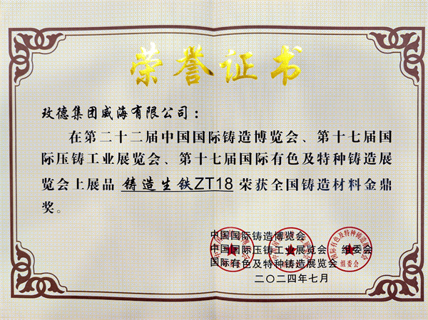 4.玫德集團(tuán)威海有限公司展品“鑄造生鐵ZT18”榮獲全國(guó)鑄造材料金鼎獎(jiǎng)。