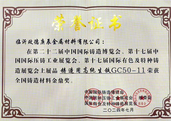 3.臨沂玫德庚辰金屬材料有限公司展品“鑄造用高純生鐵GC50-11”榮獲全國(guó)鑄造材料金鼎獎(jiǎng)。