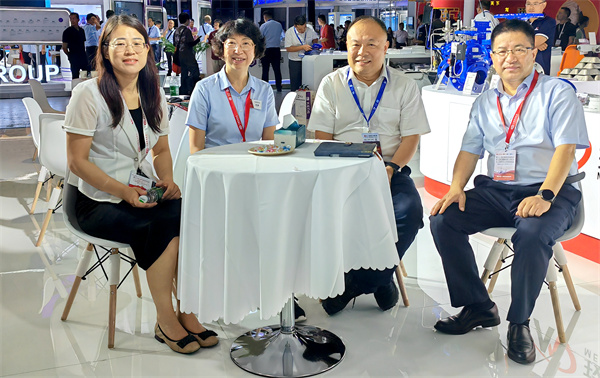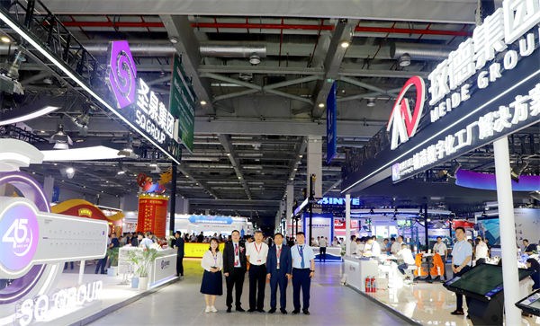 濟(jì)南圣泉集團(tuán)股份有限公司總裁唐地源、煙臺(tái)勝地汽車(chē)零部件制造有限公司總裁張寶芝蒞臨玫德展位參觀考察,玫德集團(tuán)董事局主席孔令磊與其共同探討玫德集團(tuán)智能制造以及數(shù)字化工廠解決方案。