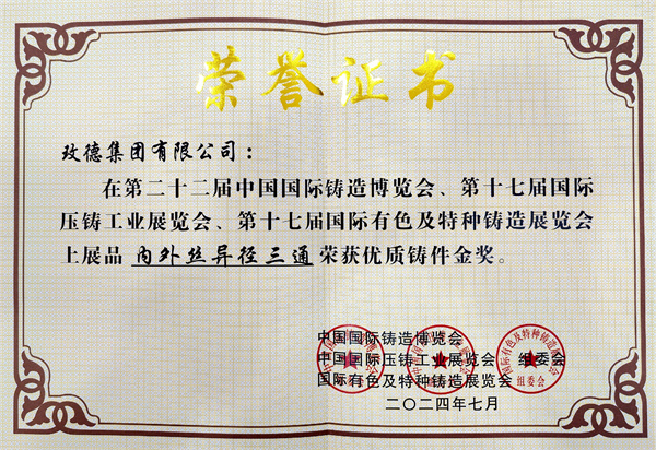 1.玫德集團(tuán)有限公司展品“內(nèi)外絲異徑三通”榮獲優(yōu)質(zhì)鑄件金獎(jiǎng)。