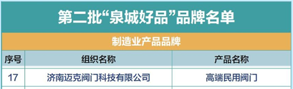 近日,濟(jì)南市第二批"泉城好品"名單正式公布,玫德集團(tuán)旗下邁克閥門(mén)憑借卓越的產(chǎn)品品質(zhì)和創(chuàng)新能力成功入選。這一榮譽(yù)不僅是對(duì)企業(yè)實(shí)力的肯定,也是玫德集團(tuán)六十余年匠心堅(jiān)守的又一注腳。
