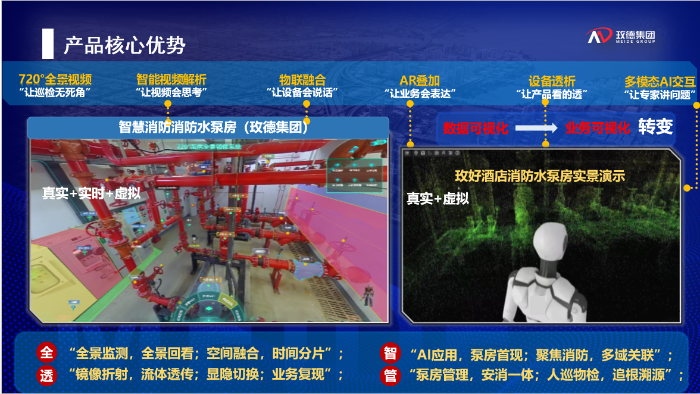 玫德智慧泵房四維空間融合系統(tǒng),依托人工智能、AR/VR及720°全景視頻技術(shù)深度融合,構(gòu)建起一套全方位、全流程、全維度的泵房智能管理體系,更是AR+全景視頻技術(shù)在流體輸送領(lǐng)域的首例實戰(zhàn)應(yīng)用,也是AI技術(shù)在水泵房場景中的首例深度應(yīng)用,開創(chuàng)了智慧消防水泵房場景應(yīng)用的新范式。